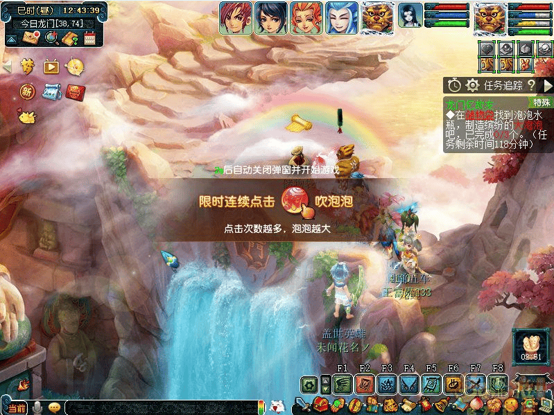 2. 每个玩家每天最多可以吹出10个泡泡,自己吹的泡泡被他人点破可得经验、金钱;点破他人泡泡可得经验、金钱,几率得物品奖励。