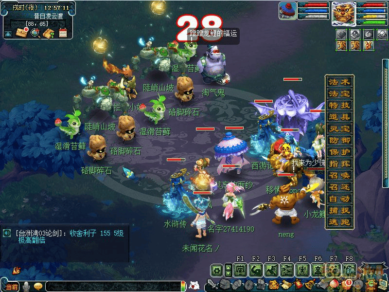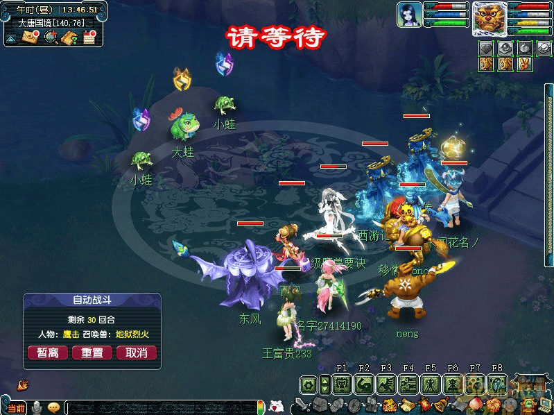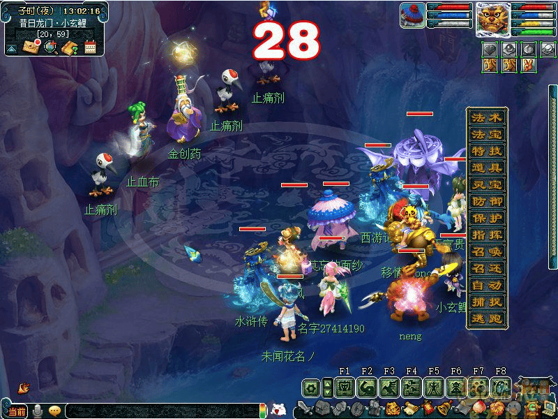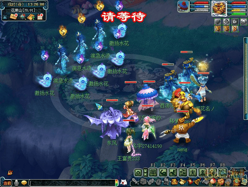湍急瀑布:化生寺,使用“金刚护法”、“推气过宫”、“唧唧歪歪”等门派法术。