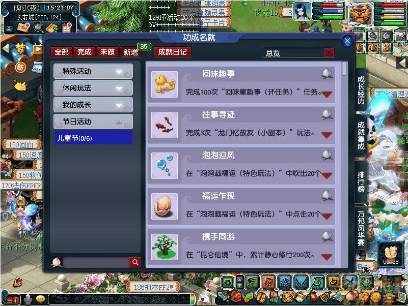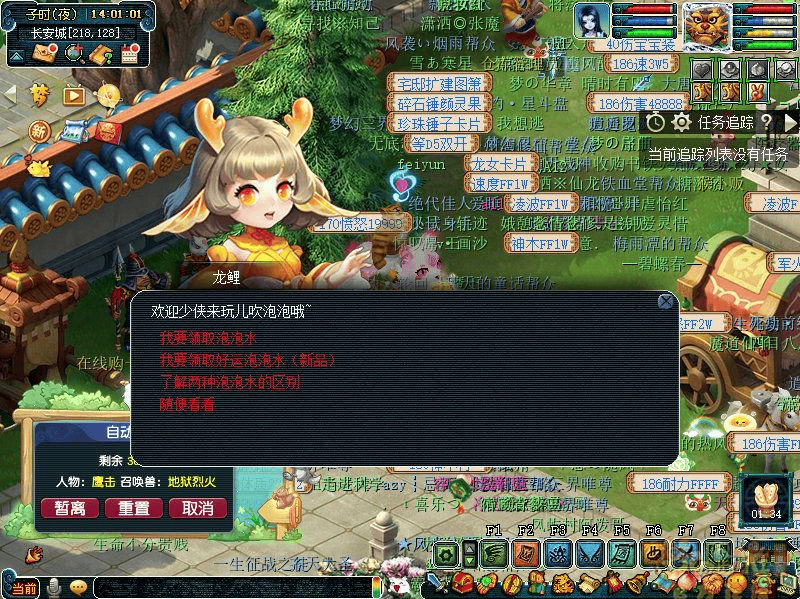 1.活动期间,玩家(角色等级≥10级,单人)可在长安城(224,123)龙鲤处领取泡泡水或好运泡泡水(新品)。