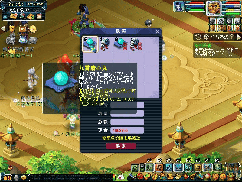 2.每天每名玩家可以在昆仑仙处购买九霄清心丸及天机培元丹,使用九霄清心丸可获得20次挂机双倍经验,使用天机培元丹可额外获得3小时挂机时间。