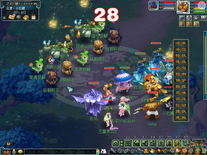 陡峭山坡:神木林,使用“冰川怒”、“荆棘舞”、“尘土刃”等门派法术。