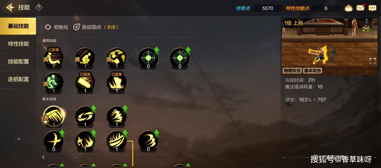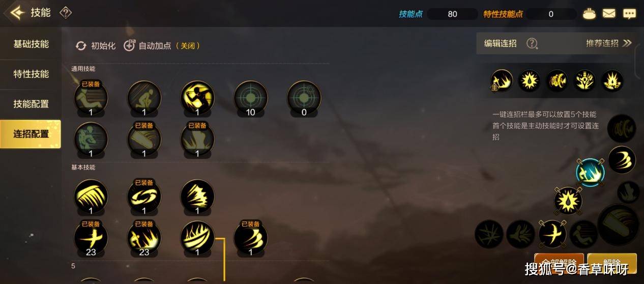 技能界面中,分别有技能加点的基础技能与特性技能、技能位置选择的技能配置及最重要的连招配置。