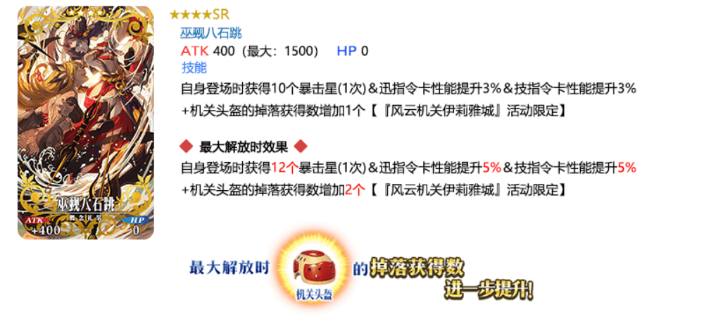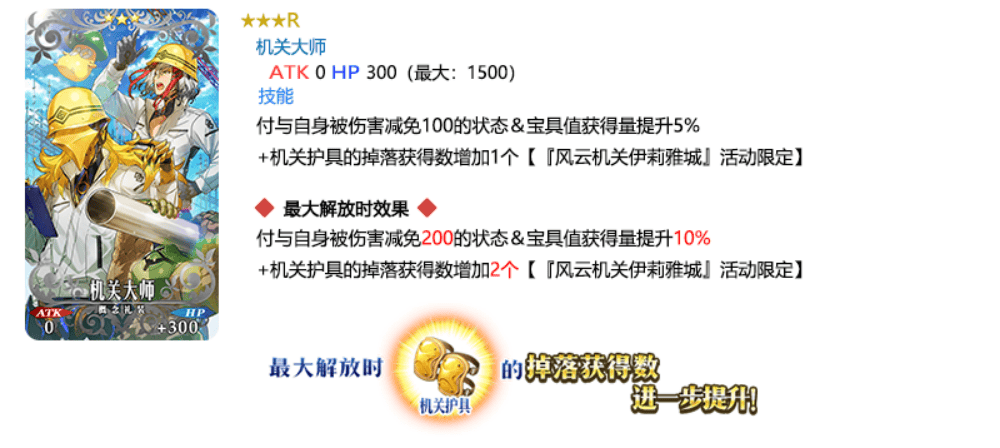 装备推荐召唤对象的3种限时概念礼装,在限时活动「风云机关伊莉雅城~果心居士微不足道的野心~」中活动道具的掉落获得数将提升!