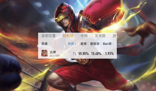 首先我们来看下达摩有多变态,且不说钻石星耀排位赛,高端局的达摩也让人头疼。他在巅峰赛的出场率高达16%,胜率接近56%,数据在对抗路英雄中第一名。新版本的达摩技能变动较大,上手难度比之前高一点,所以达摩的热度还不是最高的,目前只有T2。随着玩家越来越熟悉达摩,相信不久后他的热度就是T0,玩家一定要提前防范达摩。