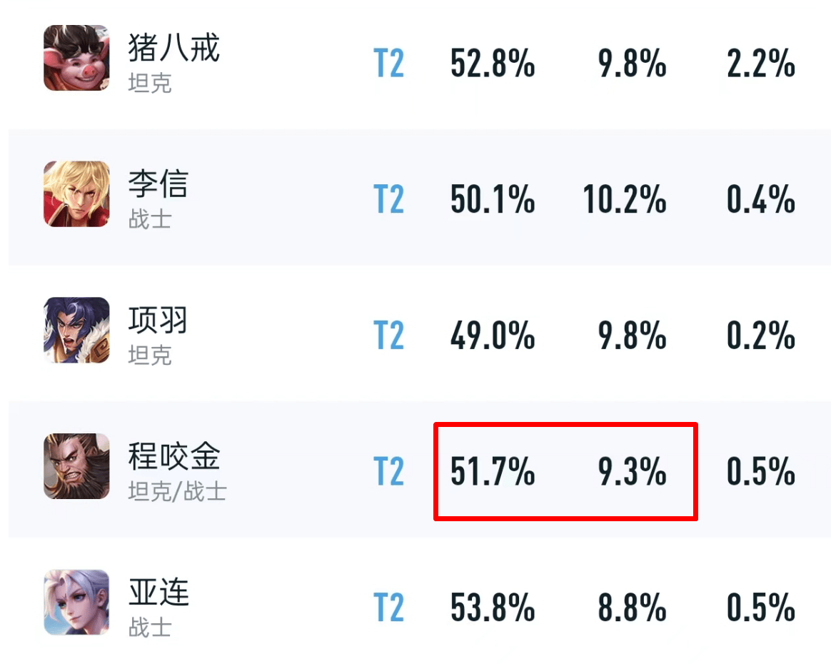 吕布加强后,唯一一个能打过吕布的坦克英雄就是程咬金,他的被动机制太过极端,血量越低伤害越高,所以程咬金一级的伤害可以做到全英雄最高,一级击杀吕布问题不大。等级越高,程咬金的作用越小,好在他吃到了火甲的福利,清线速度和攻击距离提升,英雄玩法逐渐快乐起来。目前程咬金的数据表现还不错,出场率接近10%,胜率也突破了51%,算是中等强度的坦克英雄。