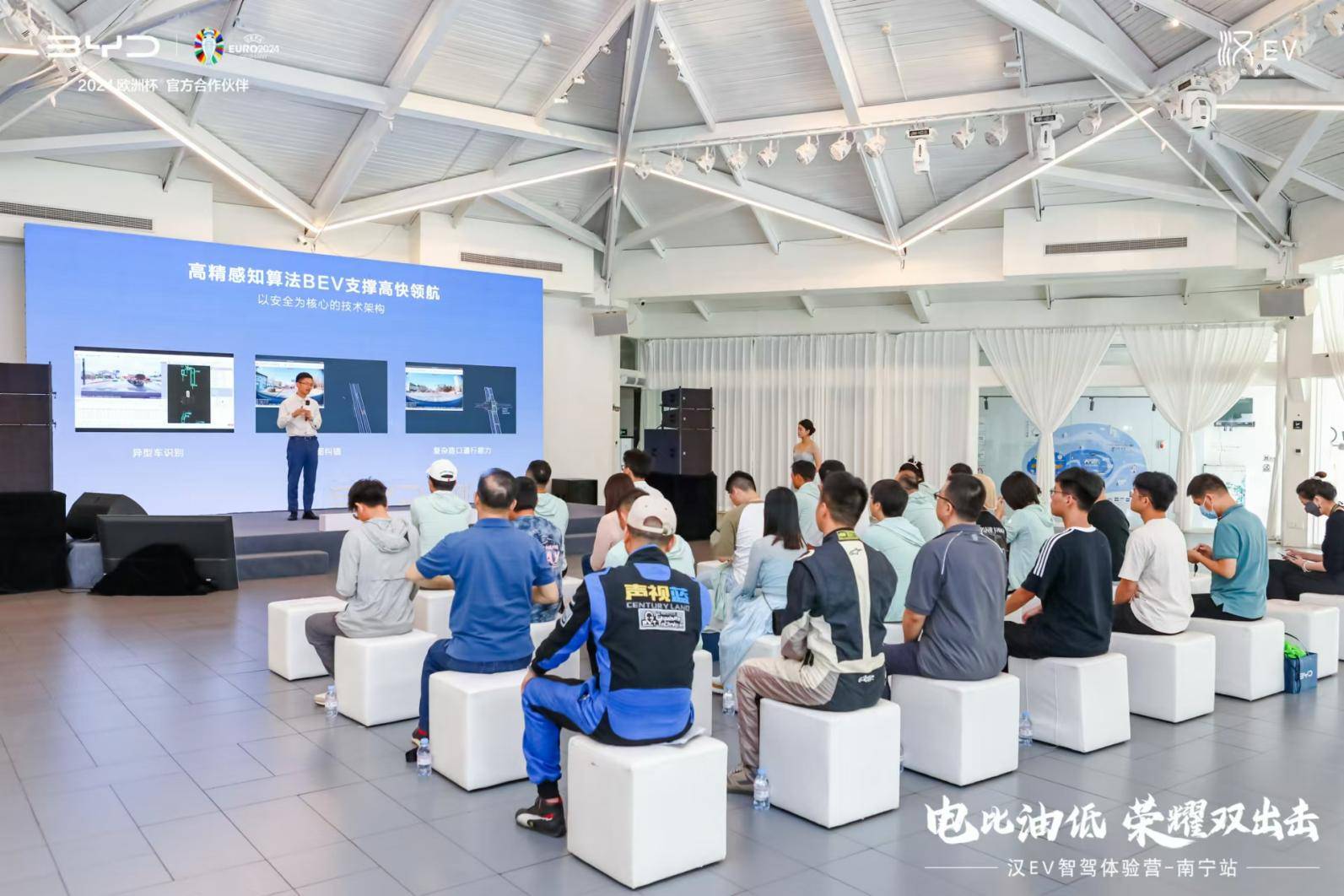 而作为体验营重要的“技术讲解”环节,比亚迪汽车的工程师也在现场详细分享了汉EV荣耀版所搭载的全新黑科技。据介绍,将在南宁开启首测的“天神之眼”,是比亚迪去年发布的高阶智能驾驶辅助系统,汉EV 天神之眼四驱智驾也是比亚迪首个搭载“天神之眼”DiPilot 100 平台的车型。搭载高性能行泊一体域控制器,拥有5颗毫米波雷达、12个多种类摄像头、12颗超声波雷达、组合惯导IMU以及高精地图,科技配置诚意十足。通过整车深度融合,将多传感器与高算力相结合,着重解决用户实际用车场景中的各种痛点。搭载“天神之眼”的汉EV,也拥有L2+智能驾驶辅助功能,如同请了一位资深“老司机”,通过学习驾驶员驾驶策略,可以实现NOA高快领航,在高速或者城市快速路可通过环境模拟显示系统,让驾驶员了解当前车辆及周边环境状态,并辅助驾驶员完成上下匝道、超车、并线、车道保持、巡航行驶等驾驶任务。