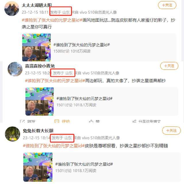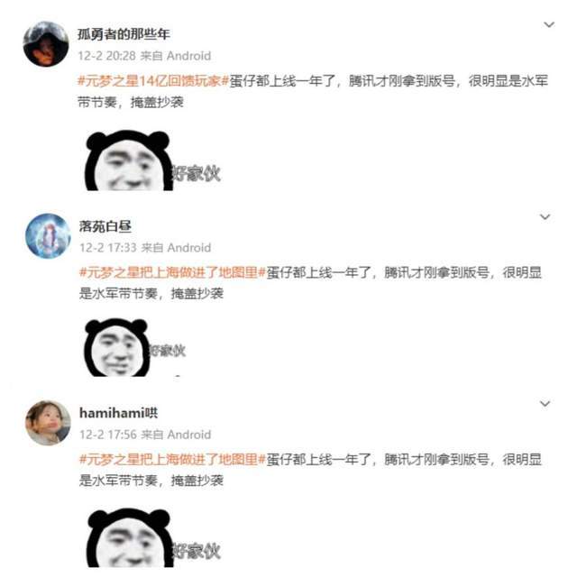 这群水军以集体行动的方式,来自同一个地方,以统一的声音在微博、知乎等平台上展开了对《元梦之星》的攻击。他们的行为方式千篇一律,一直回复相同的话题,发着雷同的微博和表情包。这种高度组织化和同质化的攻击让人不禁怀疑是否有组织、有预谋地对《元梦之星》进行负面宣传和负面炒作。