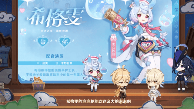 弓箭水元素奶C,元素战技的水球泡泡会在怪物身上弹跳造成水元素伤害,水球泡泡会随着弹跳次数逐渐变小,并恢复除希格雯之外的所有角色的血量,水球消失恢复自身血量。并且元素战技会产生2个源水之滴,捡起源水之滴会附予生命之契,清除生命之契。