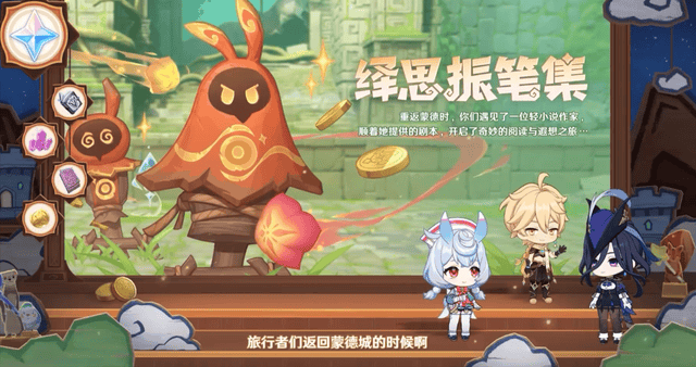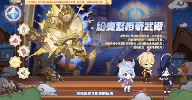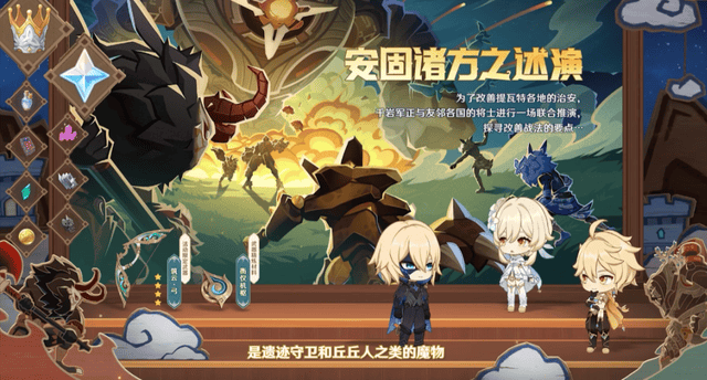 版本大活动,是一个放置策略类游戏,进攻想定和防御想定两种玩法,是以前的机关棋谭的活动升级版活动,不同怪物之间有克制作用,比如用牛头怪打丘丘射手,可以更容易获得胜利。还可以获得新的满精4星武器,活动结束就绝版。