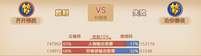 从赛后数据来看,双方在输出能力上差距非常大,【齐开得胜】人物伤害为74.7万,比【劝你善良】高出五倍左右。由此可见,即便阴曹地府可以限制九黎城的发挥,但也需要拿到物理速度和节奏优势,否则很容易被其打出爆炸面伤!