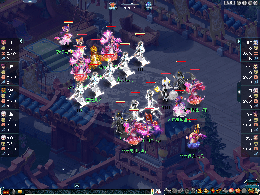 比赛开始后,【齐开得胜】靠着阵法大克优势不断压制【劝你善良】整体血量,比赛第5回合就靠着“∞”伤害秒掉了化生寺。虽然【劝你善良】凭借出色的抗性和无底洞辅助展示稳住了节奏,但在丢掉物理一速的情况下很难反制。
