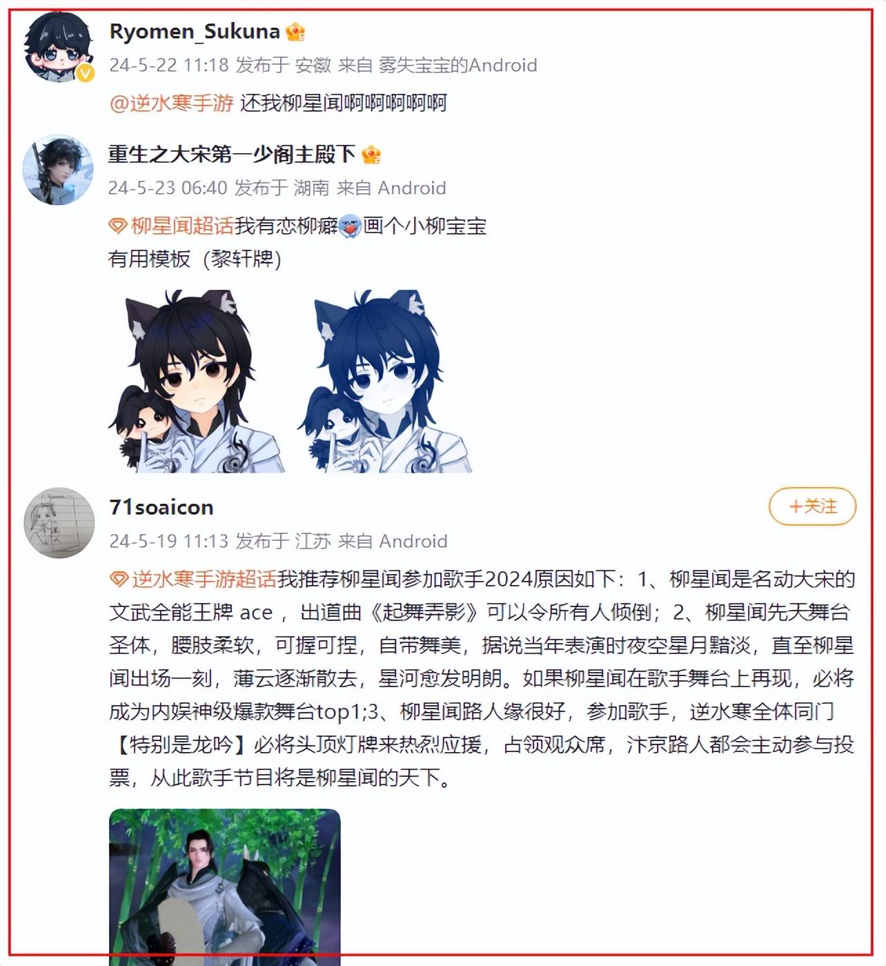 这也不是,那也不是,喜欢柳星闻的玩家们是哭成了一团,有才华的玩家更是十八般武艺齐上阵,从手绘到申请他参加歌手综艺,想要曲线复活一下心中的男神。