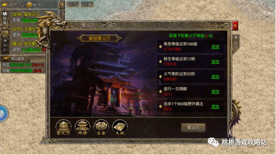 人物等级需要达到一百八十级,转生等级要达到十二级,义气等阶达到三十二阶,进行一次捐献,击败一个八佰级的野外霸主。可能是因为这个聚义厅的设定本身就比较高级,所以我们距离解锁这个副本的差距还是有一点的,但也不算特别大,基本上每个限制都需要我们的玩家,花上一小段时间,去做一些努力,才能完成它们。让我们一起为了这个目标努力吧!