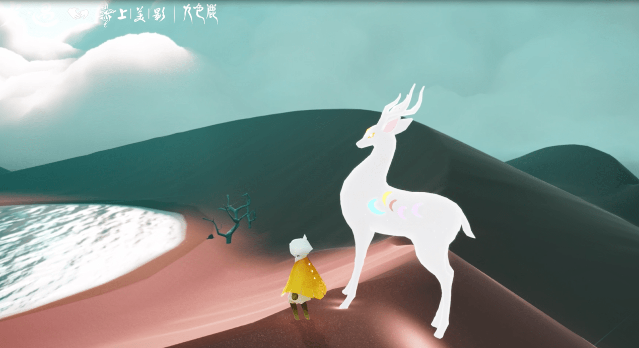 与九色鹿的联动,《光·遇》官方在游戏中加入了沙漠、敦煌等元素。荒茫戈壁中的宫殿、宫殿内的千佛壁背景都精致呈现,仿佛又回到留在了童年记忆中的九色鹿,从壁画中飘然降临俗世。本次联动,是对童年时光的缅怀,更像是对敦煌文化的守护。