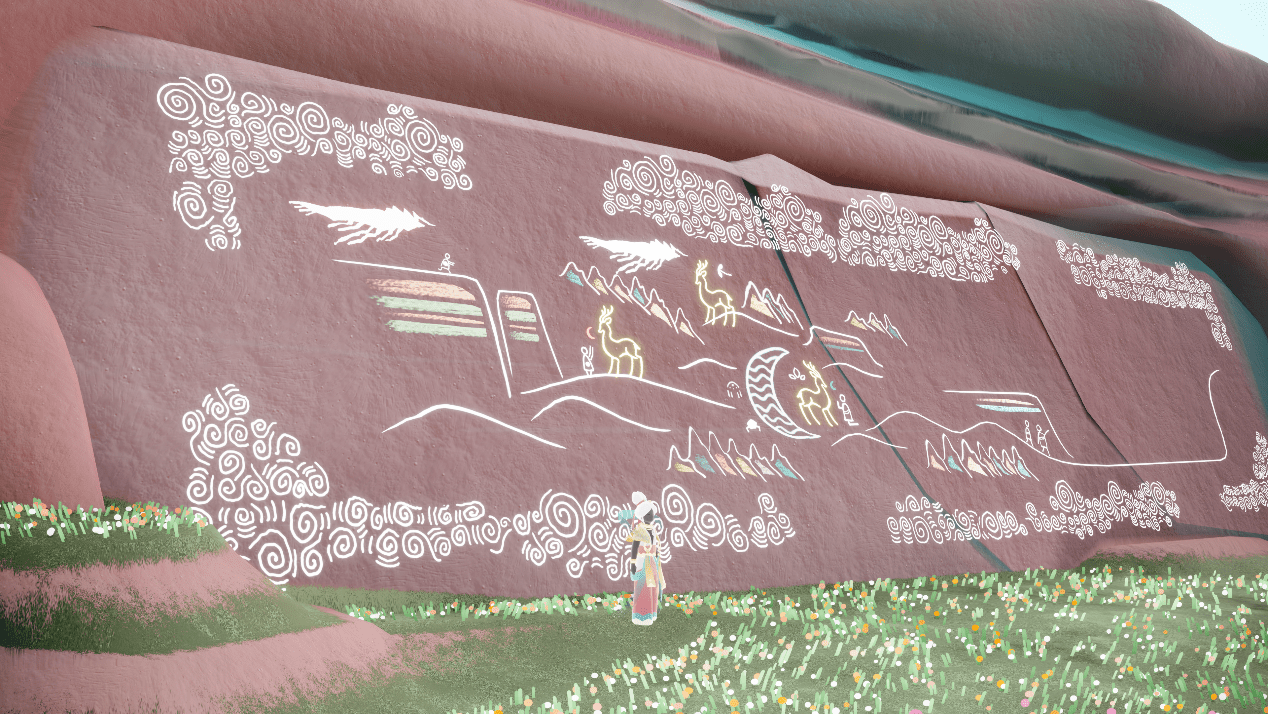 《光·遇》在此次破壁次元之旅中,四位先祖将踏足翠绿而神秘的月牙绿洲。如何在游戏中,将具有一定审美门槛的敦煌壁画,尽可能让玩家看明白并喜欢上呢? 《光·遇》通过动作解锁,特色礼赠及壁画打造、音乐元素等交互,让玩家能够听见飞天,看见飞天并感受飞天。在绚烂而神秘的月牙绿洲里,光之子在空中飞舞盘旋身姿翩翩,让玩家彷佛置身于敦煌的月牙泉和莫高窟,感受敦煌飞天壁画的魅力。