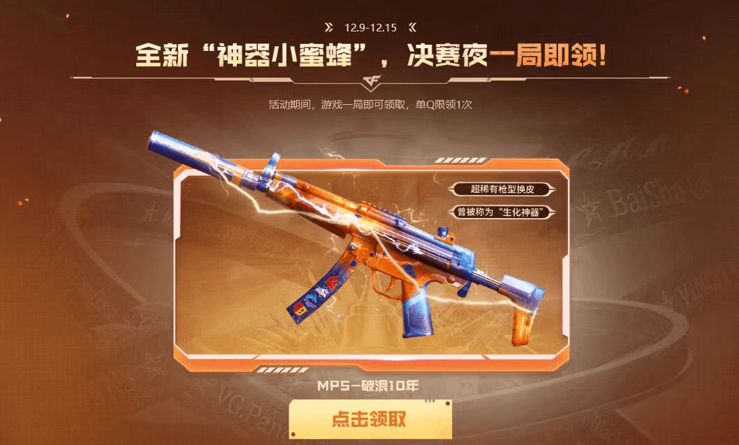 这次活动除了英雄级武器龙啸-烈火龙威的预约开启之外还有全新”神器小蜜蜂“MP5-破浪十年倾情放送,只要在12.9-12.15日期间游戏一局即可免费领取。这款武器是专为纪念CFS十周年特别射击的系列武器,子弹具备”空尖弹“效果,具有跟”MP5-SS“相同的武器性能。作为老牌武器,这次免费送出,不仅能弥补没有MP5-SS武器玩家的遗憾,还能带给拥有武器的玩家一种不一样的冲锋体验,大家可千万不要错过哟!