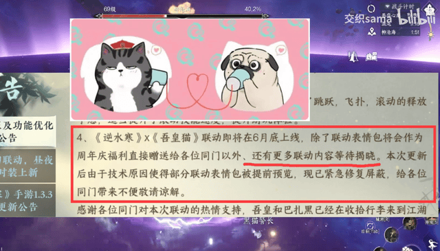 发现自己藏的惊喜这么快就被玩家们发现后,《逆水寒》手游官方也不装了,直接发公告表示《逆水寒》手游跟《吾皇猫》的联动即将在6月底上线,除了联动表情包会直接作为周年庆福利赠送给玩家植物,还有更多联动内容和福利等待揭晓。这一说明,也给玩家们吃了一颗“定心丸”,大家只需要等到6月底,就能恭迎吾皇降临了。
