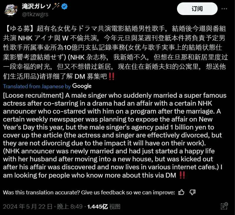 据爆料人滝沢ガレソ5月22日发推称,某位因主演电视剧而知名的男歌手,和超级女明星结婚后,因近期出轨女主播,两人已经离婚!