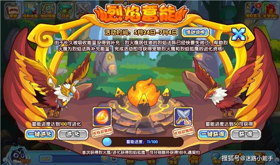 当蓄能进度达到50点,就可以领取:烈火鹰,蓄能进度达到100点方可解锁:烈焰孤鹰 进化资格。预计本次领取宠物不重置蓄能进度,具体以游戏为准。