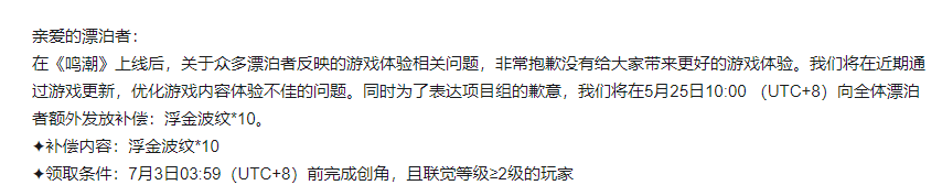 在《鸣潮》上线后,关于众多漂泊者反映的游戏体验相关问题,非常抱歉没有给大家带来更好的游戏体验。我们将在近期通过游戏更新,优化游戏内容体验不佳的问题。同时为了表达项目组的歉意,我们将在5月25日10:00 (UTC+8)向全体漂泊者额外发放补偿:浮金波纹*10。
