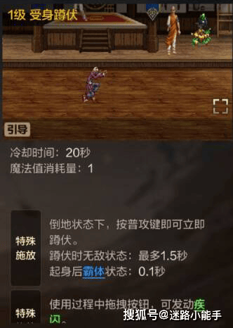 受身蹲伏在被对手击倒后可以使用,倒地状态下按住该技能不放可以在短暂时间里处于下蹲无敌状态,躲避对手的后续技能,配合使用疾闪能够快速拉开安全距离。