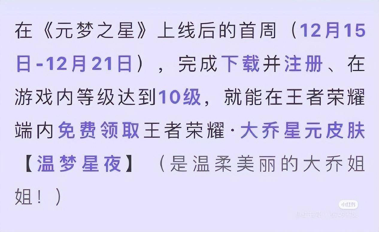 其实元梦之星能够获得如此成绩,总结下来一共有三个原因。第一个原因就是元梦之星上线之前,就已经宣布了将会和同为天美游戏工作室旗下的王者荣耀进行深度联动,参与元梦之星游戏不但可以获得王者荣耀的联动时装,元梦之星游戏角色达到十级之后,玩家还可以在王者荣耀游戏里获得大乔的星元皮肤,有了王者荣耀这一款现象级的游戏做引流,元梦之星想不火都难。