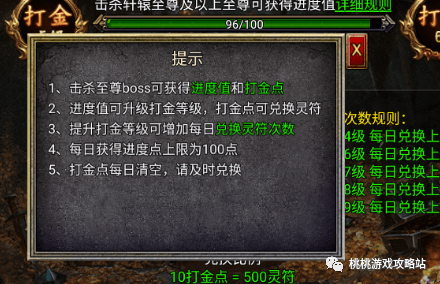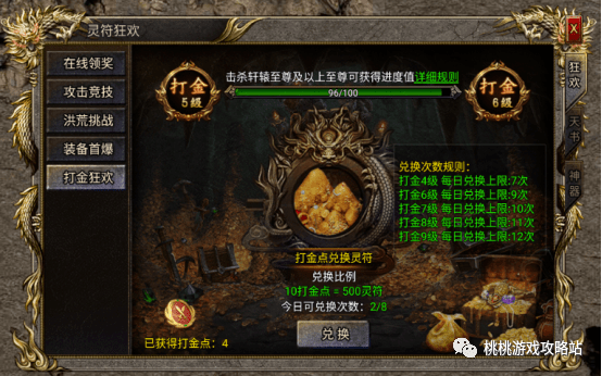 在首页的灵符狂欢按钮里有一个叫打金狂欢的活动,根据友友们的打金等级,像我现在是打金五级,每十个打金点可以兑换五百个灵符,每天可以兑换八次,如果我能升级到九级,那么我每天可以兑换九次。击败至尊BOSS可以获得进度值和打金点,每天获得进度点的上限为一百点,打金点每天清空,友友们请及时兑换哦!忘了,那可就有点小亏了。