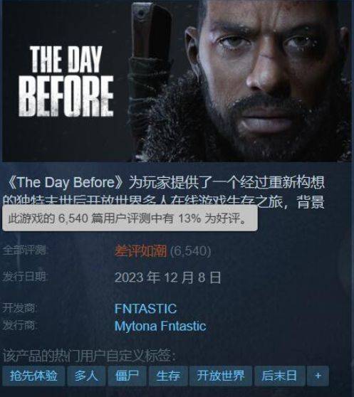 近日,备受期待的开放世界末日生存游戏《浩劫前夕》终于结束了漫长的等待,以“抢先体验”的形式和玩家们见面。然而,这款游戏却未能满足玩家的期望,目前在Steam平台上的好评率仅为13%,引来了大量的批评和不满。