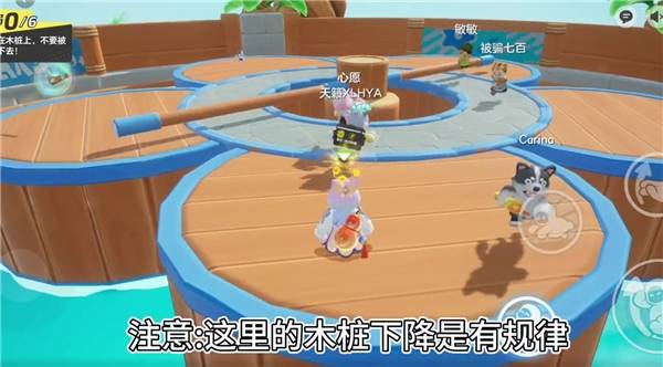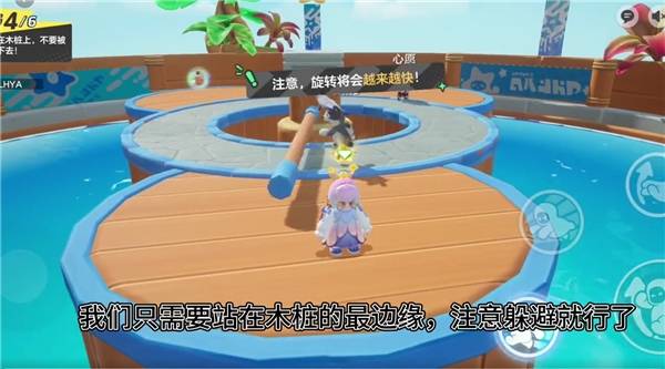 在游戏进行之前,我们先要了解本关的构造,分为中间一个木杆,周围五个木桩。注意:木杆里面是空心的,不建议走里面跟着一起旋转,因为有可能会掉下去。