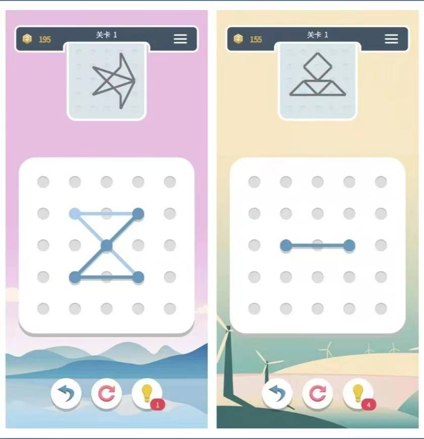 它的经典模式难度一般,镜像和拼图模式难度会增加,其中镜像模式也就是具有镜像线段的模式,你拖动一根线段,另一根镜像线段也会随之拖动。