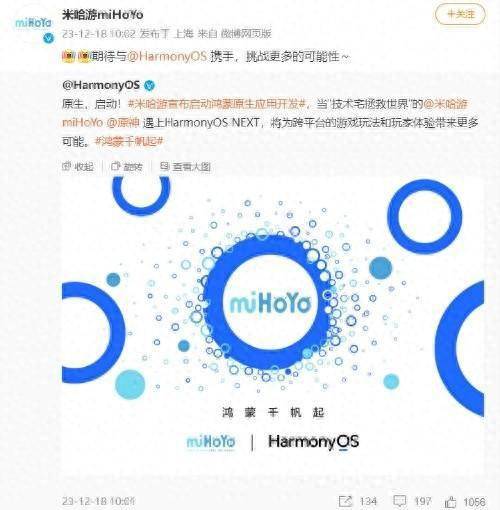 华为宣布,米哈游将启动鸿蒙原生应用开发,“当‘技术宅拯救世界’的米哈游miHoYo遇上HarmonyOS NEXT,将为跨平台的游戏玩法和玩家体验带来更多可能。”米哈游也随即表示:期待与HarmonyOS 携手,挑战更多的可能性。