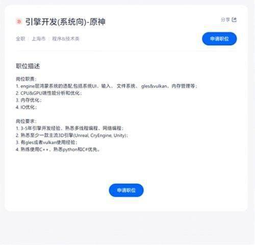 据悉,早在11月末米哈游便上线了针对鸿蒙的引擎开发职位,目前启动鸿蒙原生应用开发的APP已经超过30多家。