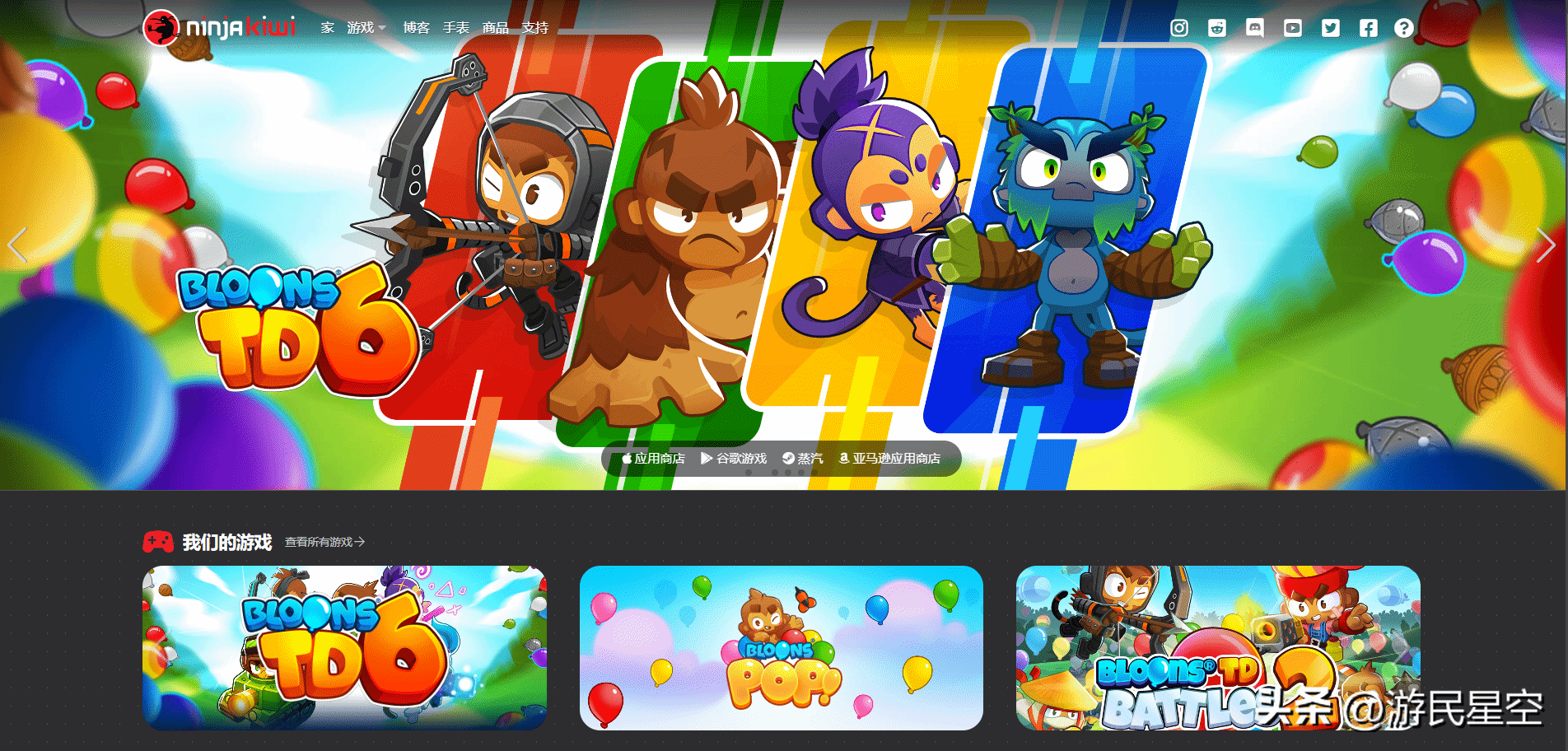 《气球塔防6》仍然是Ninja Kiwi官网页面上的主角