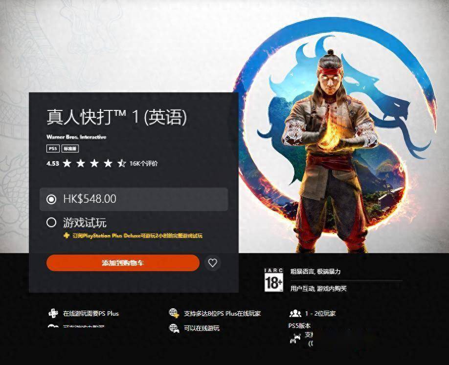 港服PlayStation Plus三档会员添加了一款新试玩游戏:《真人快打1》,现在订阅该服务的玩家最多可以试玩该作2个小时,购买正式版后,所有试玩的进度和奖杯都将被继承。不过值得注意的是,PS5版的《真人快打1》暂不不支持中文,存储占用114.414GB。