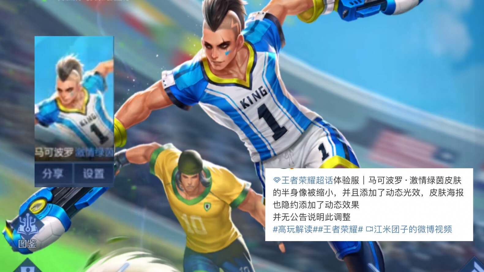 最后就是马可波罗的伴生皮肤激情绿茵了,这款皮肤近期在体验服它的伴生像还有海报都进行了优化,伴生像被缩小了,还增加就动态光效,皮肤海报也隐约增加就动态效果,难道马可波罗真的有新皮肤计划了?会不会是圣斗士系列呢?毕竟早在很久之前就说过马可波罗会有圣斗士星矢联动皮肤了,而且据说在近期圣斗士星矢联动皮肤也会续更,再加上体验服伴生皮肤突然优化,所以这不得不让人怀疑了。