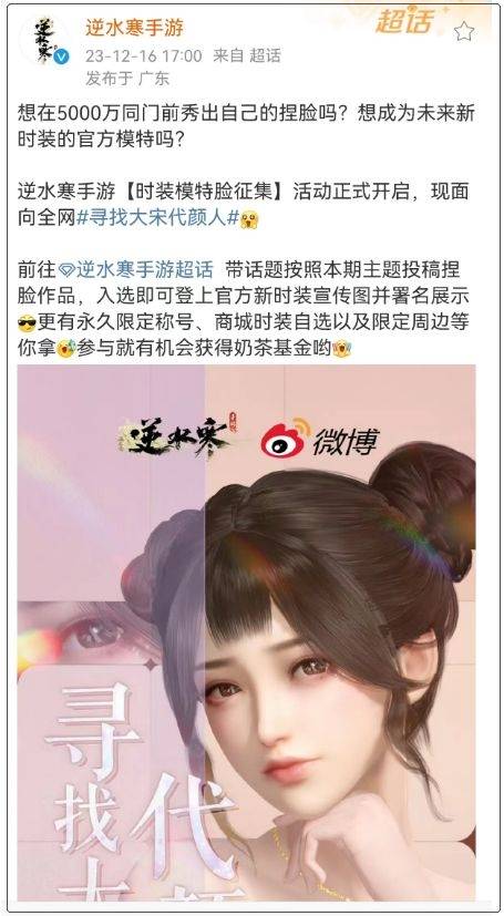 因为这款游戏捏脸、外观自由度都太高了,“寻找大宋代颜人”发布才刚刚一天,《逆水寒》手游超话就被冲爆。