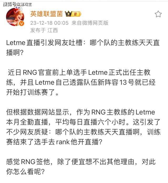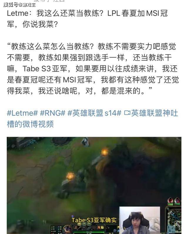 本来let me成为战队的主教练是一个好事情,所有人都希望他能够帮助队伍走出困境,但是在最近一段时间,他的直播成为了很多玩家吐槽的一个点,大家都觉得既然成为了教练,就应该和队员们好好训练并研究战术,每天平均六小时的高强度直播真的应该吗?还有一些人吐槽,教练这么菜怎么当教练?教练不需要实力吧感觉不需要,教练如果强到跟选手一样,还当教练干嘛,Tabe S3亚军,如果要用以往成绩来讲,我还是春夏冠呢还有MSI冠军,我都有这种感觉了还觉得我菜,我还说啥呢,对,都是混来的。