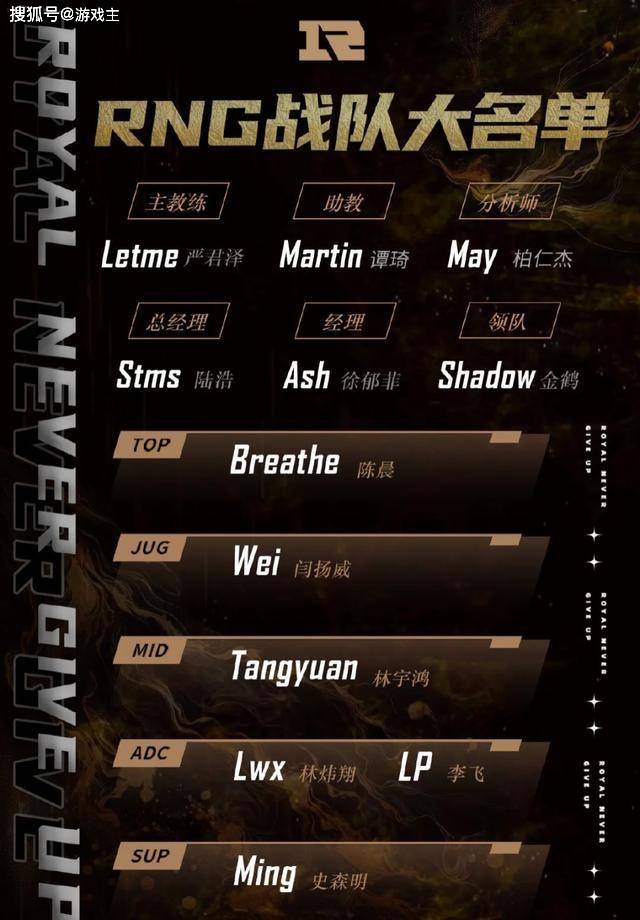上单呼吸哥,打野wei,中单tangyun,AD LWX,辅助小明。说实话,从阵容的配比来看,除了中单位置以外,其余的四名选手都是lpl赛区比较出名的国产。小明的回归很实是让很多的玩家没想到的,可能也是rng战队给了一定的许诺吧,毕竟可以全身而退的离开这个队伍非常的不容易,很少有人会选择和这个队伍继续签合同。就连之前let me在表直播的时候公开表示,rng战队和他谈教练的时候并没有表示会有这么高强度的阵容,自己回来之后,连小明都续约了。