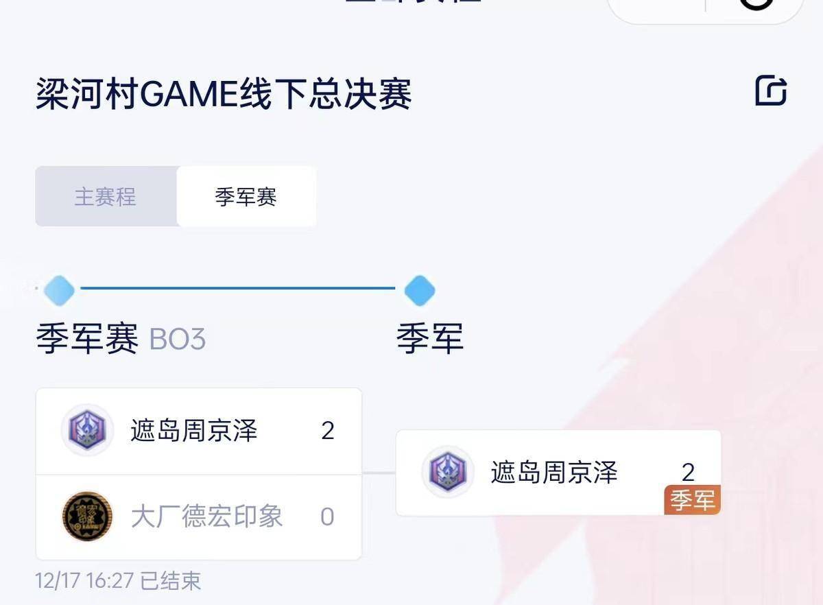 另一场半决赛由大厂恐龙抗狼与大厂德宏印象两队之间开打,在这场比赛中,大厂恐龙抗狼展现出了非常强大的团队实力,队内打野位选手更是将节奏直接拉满,在对局中不断游走,给到了对手非常大的压力。最终,大厂恐龙抗狼以2:0的大比分优势,击败大厂德宏印象进入决赛。而大厂德宏印象又在随后的季军赛争夺中不敌遮岛周京泽,最终遗憾位居第四。