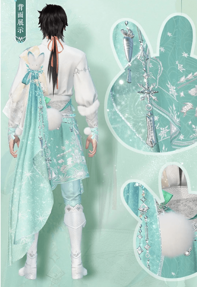 男款“灵兔献瑞”则主打的就是一个反差感。腰封、立领和长袖配护肘的版型高冷禁欲范儿十足,实则目光滑下去就会发现,这雪花形状扣子扣得那么松,胸肌都半露不露的了是干嘛呀~下装部分白绿的配色也是清新又耐看,至于兔子元素?看到背面披风和腰部上的白色毛球了吗?甚至银饰链子上也有胡萝卜的装饰,真就兔子精下凡实锤了!