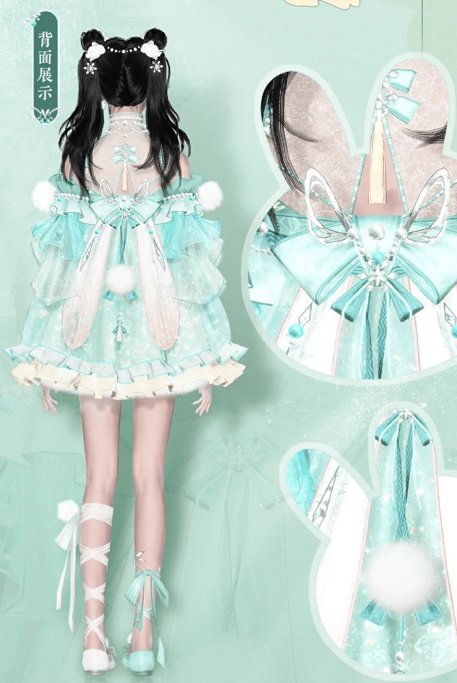 女款“灵兔献瑞”是一套可可爱爱的小裙子,露肩的设计真的十分减龄!耳环、双肩、胸口和下摆处都有白色的毛球饰品点缀,非常适合冬天不说,多而不杂的排布也精致无比,更别提还有脖颈上的珍珠项链提升质感了。而再把目光放到背后,就会发现:从浅色的蝴蝶结下延伸出来的,居然是对玲珑兔耳!谢邀,已经在想象穿上时装,跑动起来它们在身后一甩一动的样子了~值得一提的是,女款“灵兔献瑞”的鞋子,还运用了绑带+不对称的款式,小心机get√