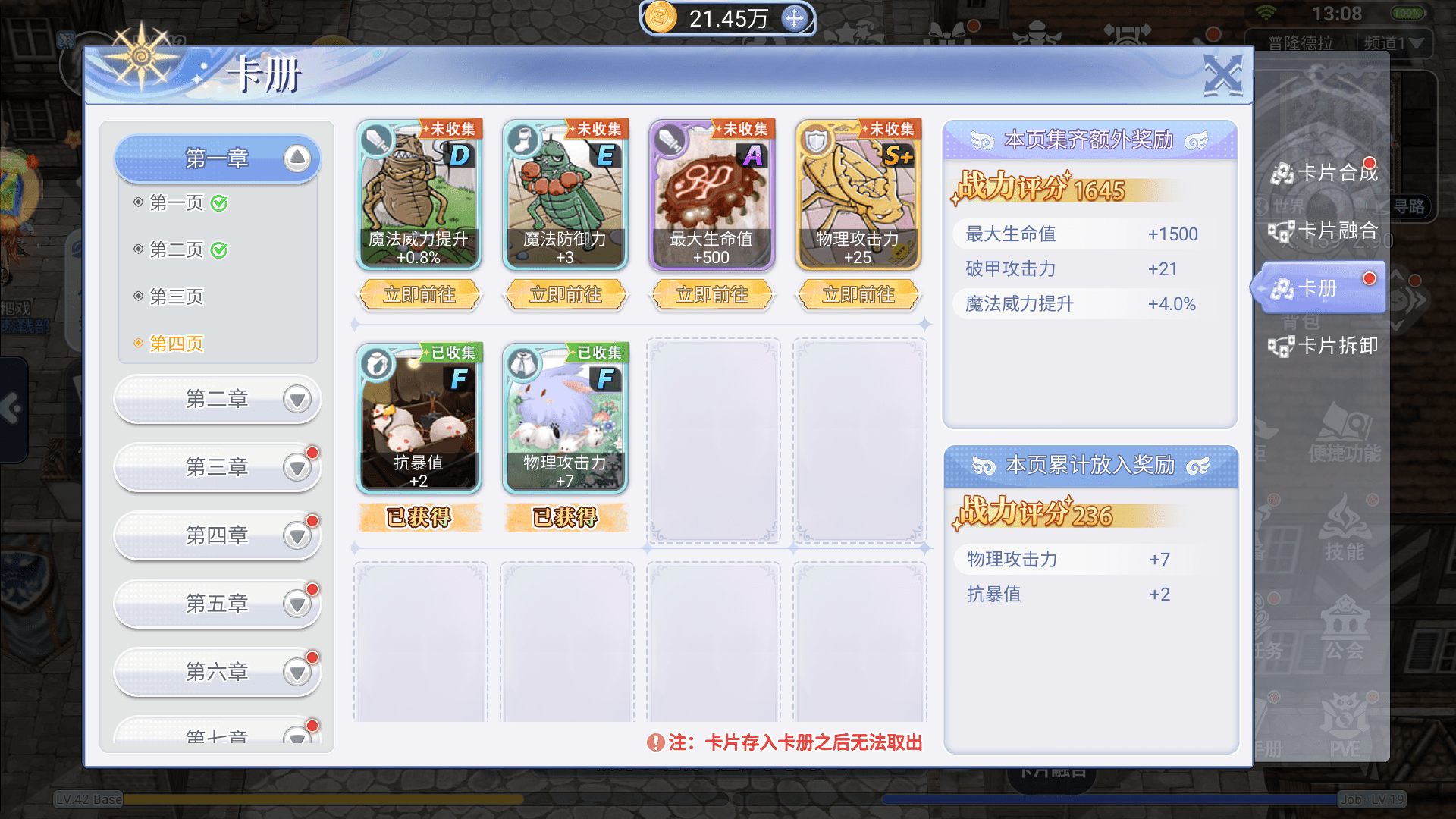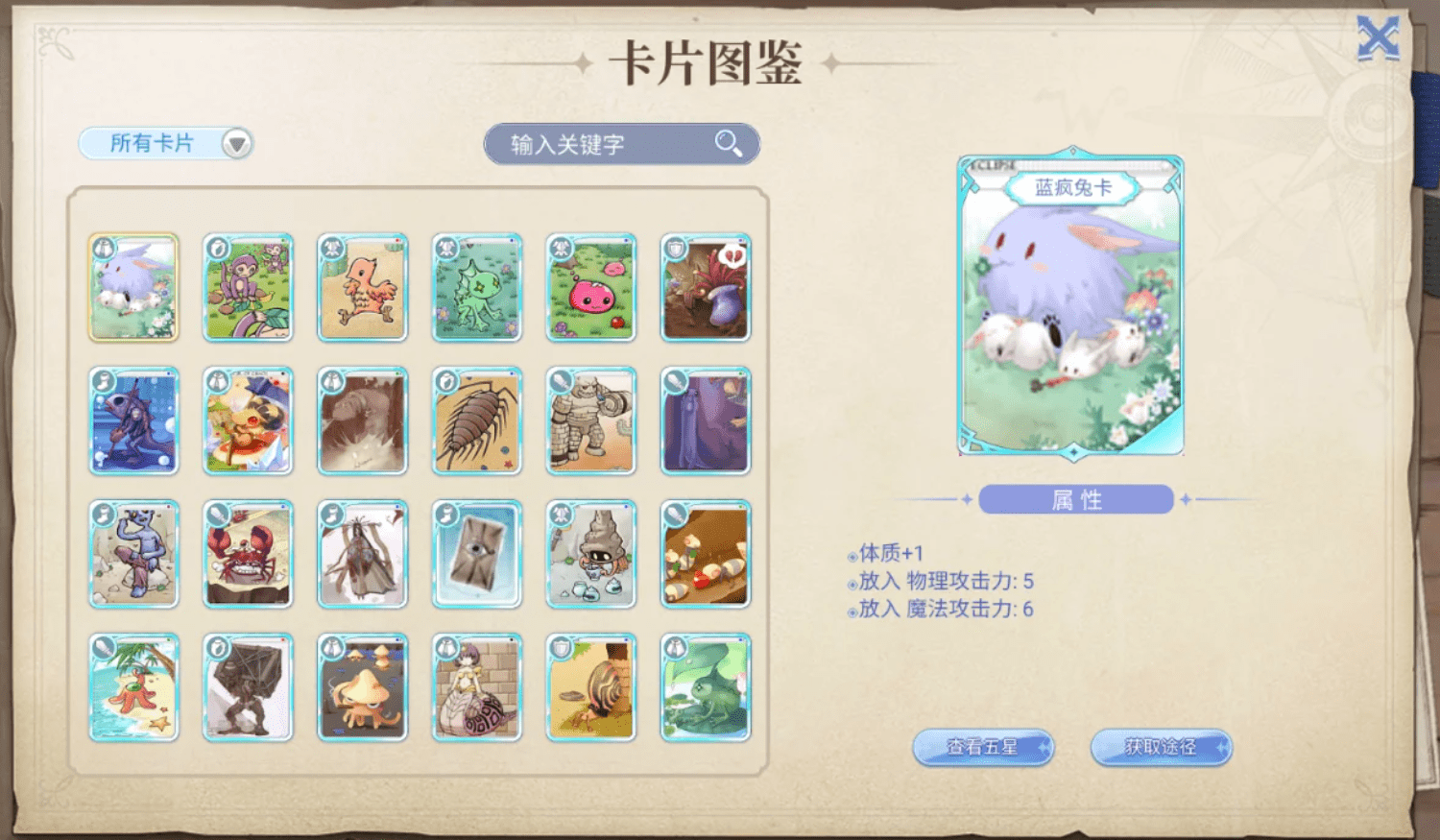 在游戏里,卡片被分为不同的等级,分别是F、E、D、C、B、A、S和S+级。F级到D级的卡片基本为蓝卡(精良),C级到A级为紫卡(史诗),S级和S+级是黄卡(传说)。不同的卡片会有不同的属性或者特点,卡片可以分为效果卡、技能卡和魔法卡这三个功能分类。效果卡:包括各种增益和减益效果,如攻击力加成、防御力加成、速度。成等。技能卡:可以学会各种技能,如施毒,解毒,治疗术,狩猎术等。魔法卡:释放各种魔法攻击,对敌人造成大量伤害。在装备上镶嵌卡片可以额外获得卡片上面的技能或属性。