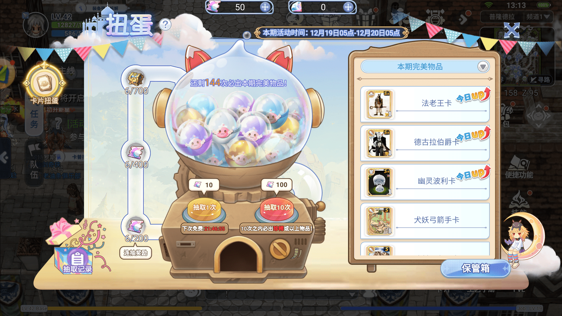 (四)扭蛋机。扭蛋机中可以抽取各种各样的卡片以及材料,且每日都有三张传说卡片的抽取概率得到提升。抓紧前往试水!!没准欧皇就是你自己!!!