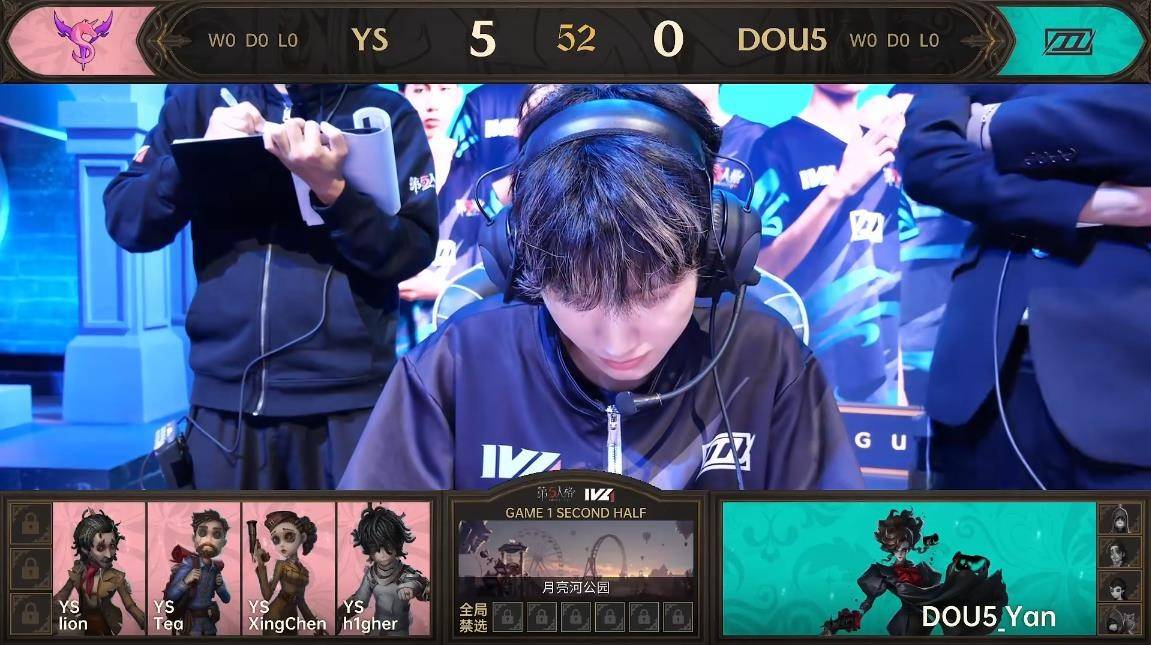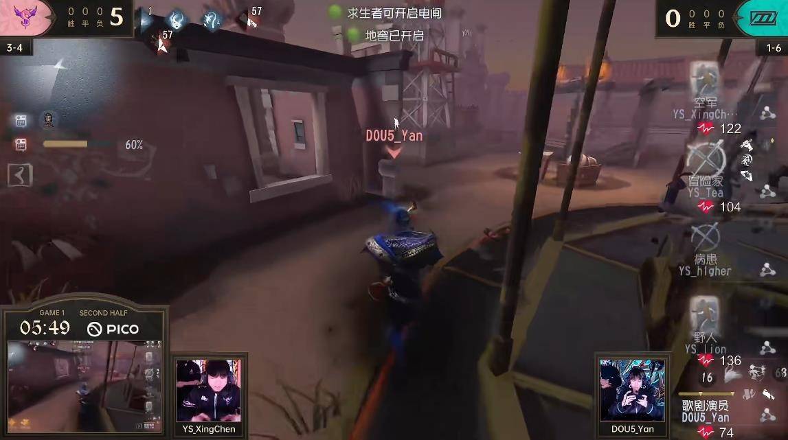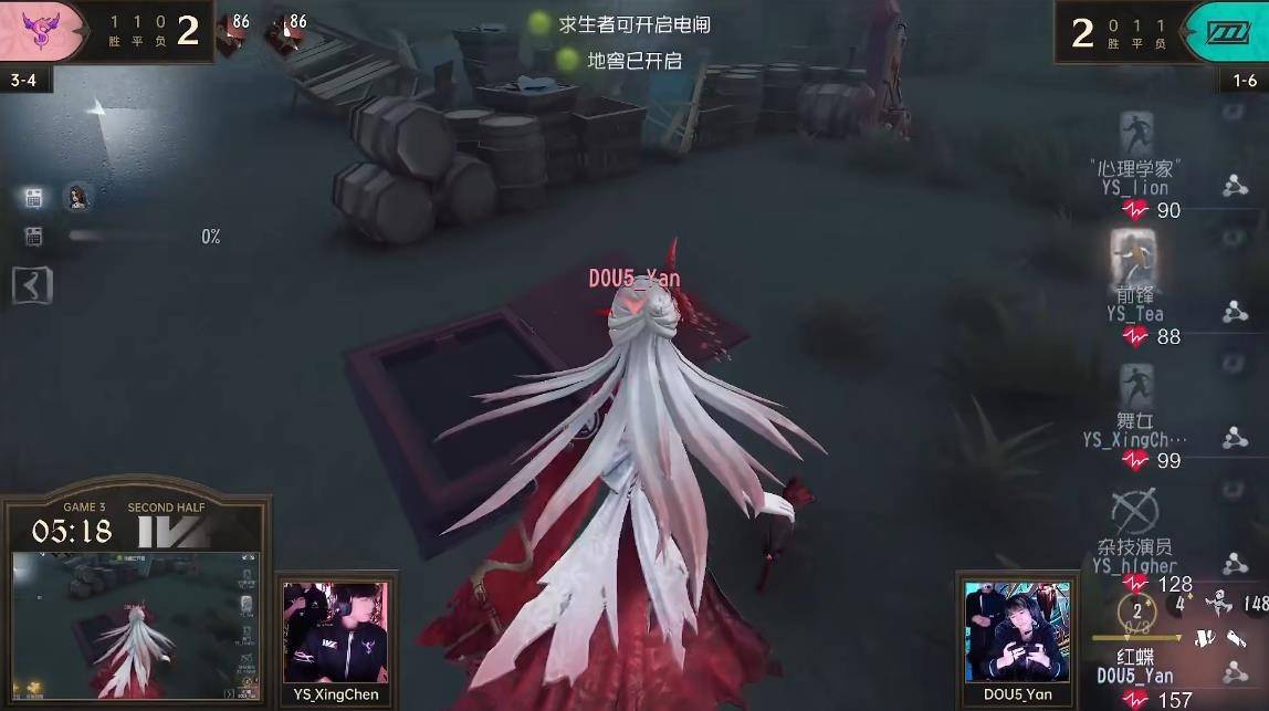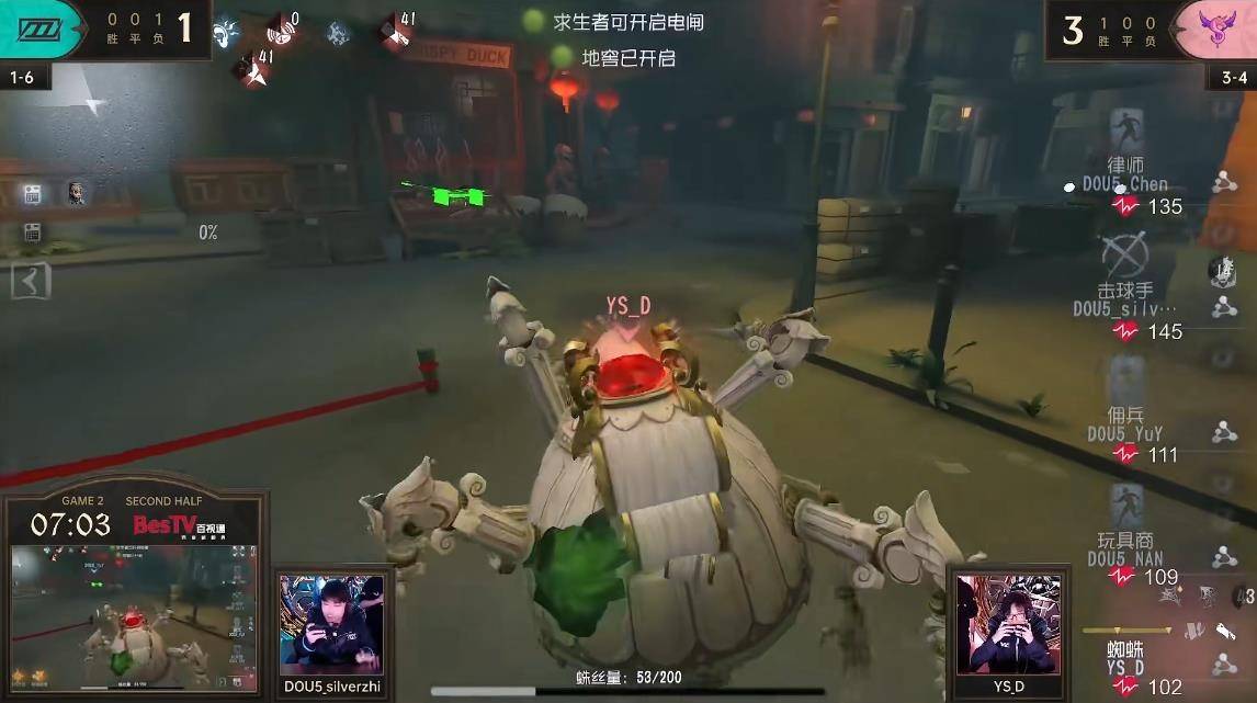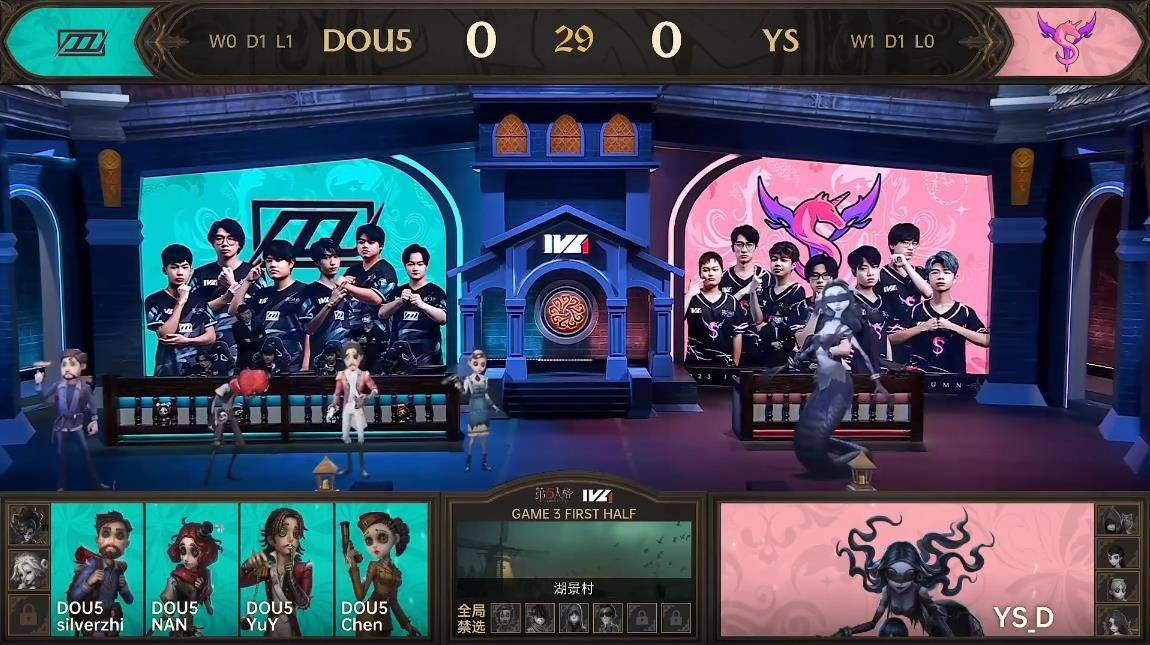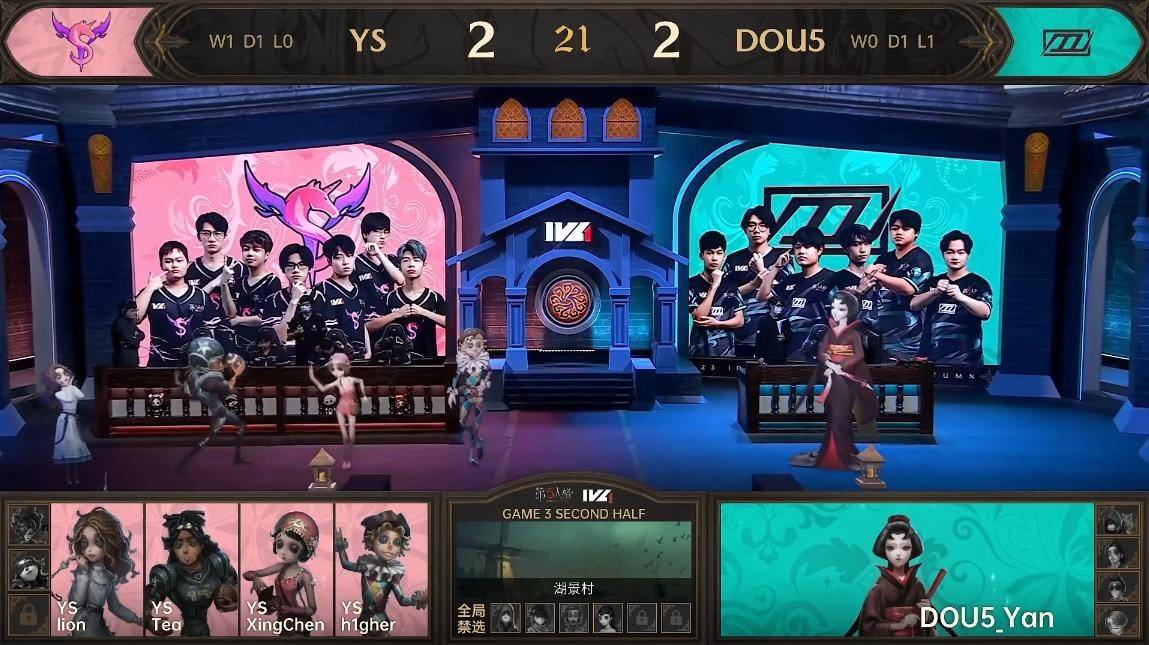 第二局比赛YS战队和DOU5战队以4:4战平,第三局比赛地图为湖景村,这张地图是求生者偏优势图。