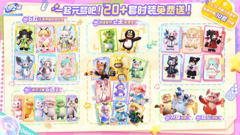 值得强调的是,《元梦之星》还为大家带来了丰厚的福利。QQ渠道可以免费获得的衣服有3个,一个是暗夜玫瑰檀雅,需要自己去QQ页面领取;一个是时之祈愿瑶,这个有一些费事,需要邀请两位好友,从好友发的链接中下载并进入游戏,打完新手教程才算数;还有一个是孙尚香,这个开局就会发送到我们的邮箱里面了,是蓝色的普通皮肤。此外,美团联名骑手皮肤也是一大亮点,登录4天即可领取,登录6天还能领取骑士背包,累计登录10天,可以领取奶萌爪爪头饰。还有喵小困、饮料背包、甜橙喵桑妮等丰厚的福利等你来领!
