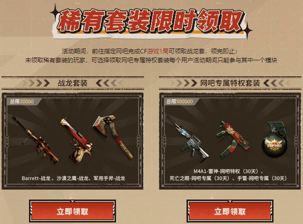你以为穿越火线的网吧专属福利只有这些吗?当然不,完成CF游戏1局,还有稀有套装可以拿呢!战龙套装和网吧专属套装二选一,不过数量有限,想要稀有套装的CFer可能要抓紧时间了,别被人抢走了。