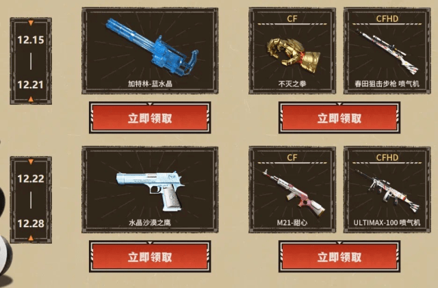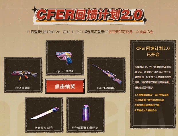 穿越火线最擅长的就是回馈老玩家了。11月登录过穿越火线的CFer,这次有福了,只要在12月份去到指定网吧登录一次CF,就能获得一次抽奖机会,五把神器等你来取。所以说,你11月份登录过穿越火线,12月再到指定网吧登录一次,那就有能获得两把超厉害的武器了。