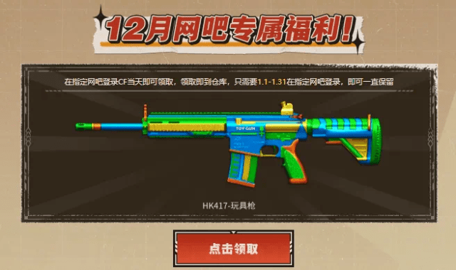 你只要在12月内去到指定网吧登录一次穿越火线,在你登录游戏的当天,你的仓库中就将多了这把HK417-玩具枪。已经领取的玩家,千万别忘了一月份再去指定网吧登录一次,这样你就能一直拥有这把HK417-玩具枪了。