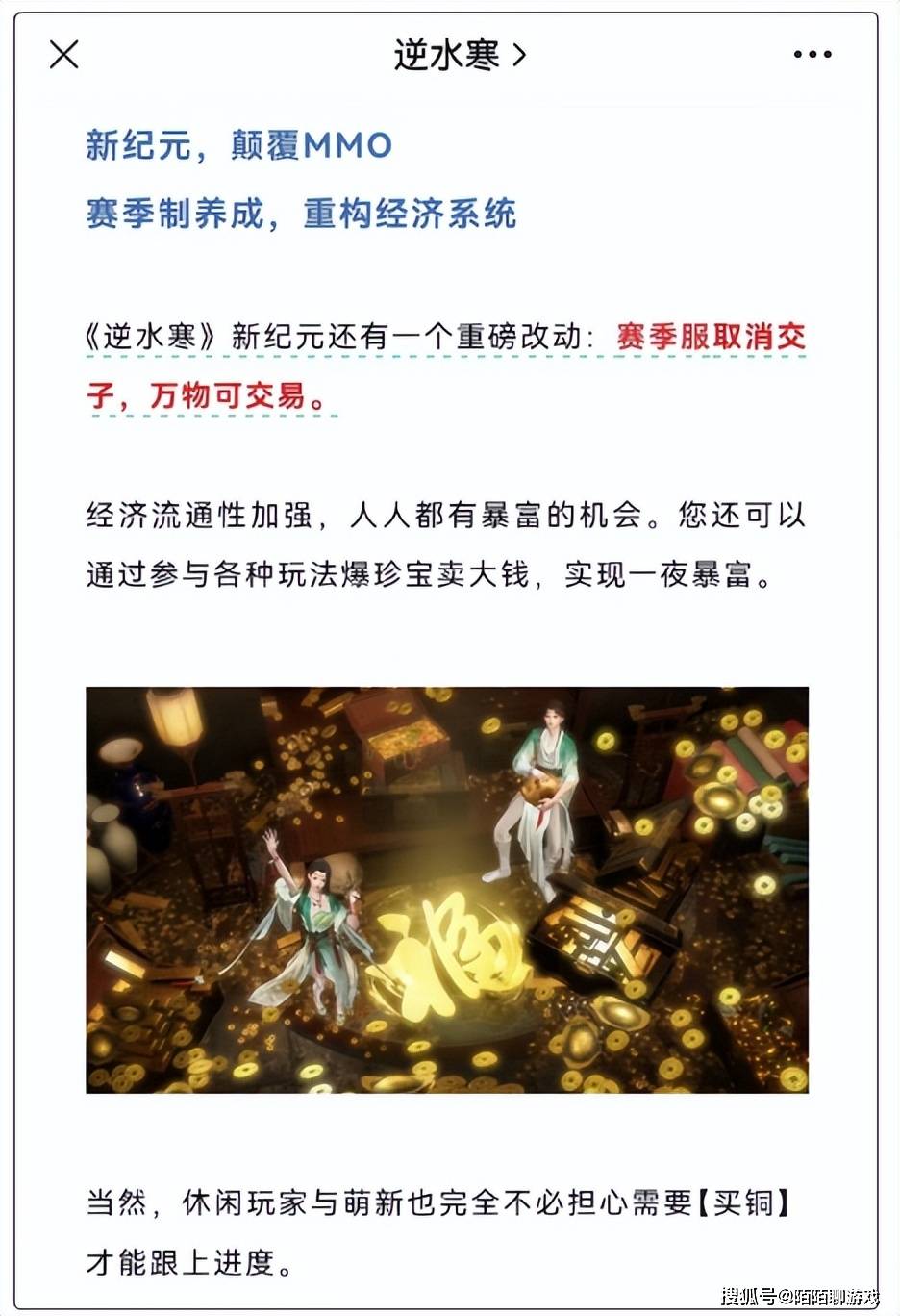 《逆水寒》新纪元还有一个重磅改动:赛季服取消交子。既然是赛季服,那也没什么好怀疑的,只看合并之后游戏的经济系统能否稳住,工作室会不会扰乱市场,就看官方的制裁力度了。