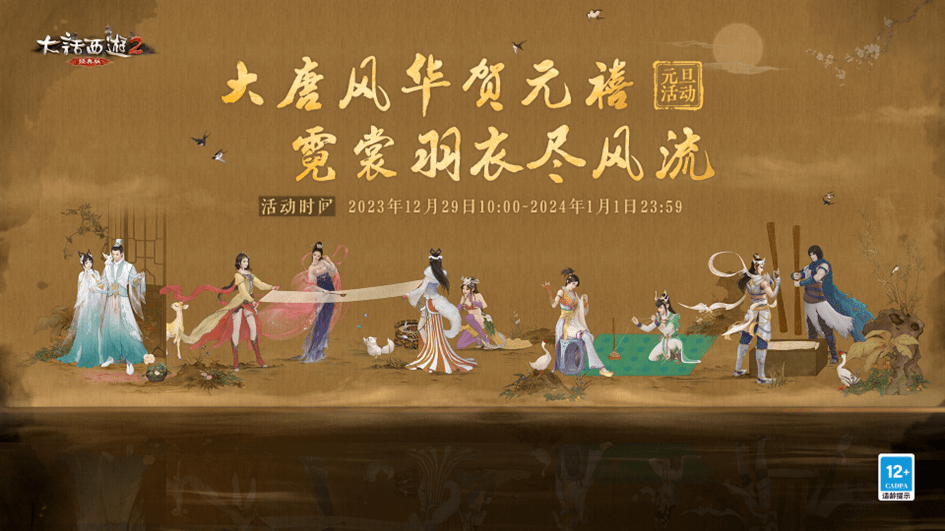 2024元旦活动-大唐风华贺元禧,霓裳羽衣尽风流将在本周维护后在局部服务器放出体验(局测活动时间为2023年12月21日10:00-2023年12月22日10:00);并将于2023年12月29日10:00至2024年1月1日23:59期间全服开放!